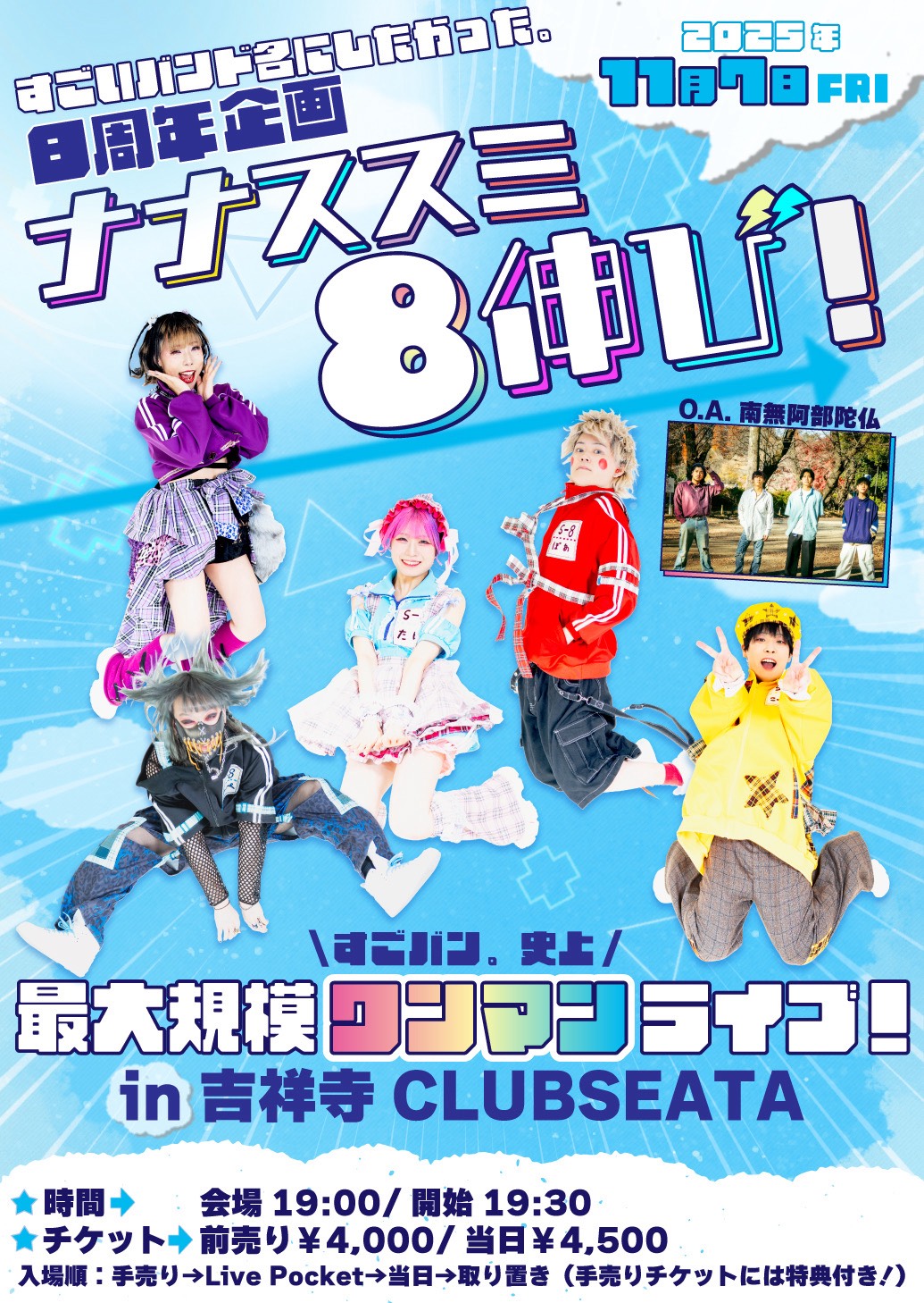 吉祥寺 CLUB SEATA スケジュール 2025.11.07(Fri) すごいバンド名にしたかった。 8周年企画 ナナススミ8伸び! [ACT] すごいバンド名にしたかった。 / O.A. 南無阿部陀仏 [OPEN/START] 19:00/19:30 [料金] ADV/DOOR ¥4000/¥4500 (1Drink代金¥700別途必要) ■チケット LivePocket 10/8 21:00〜 https://t.livepocket.jp/e/x9a1v