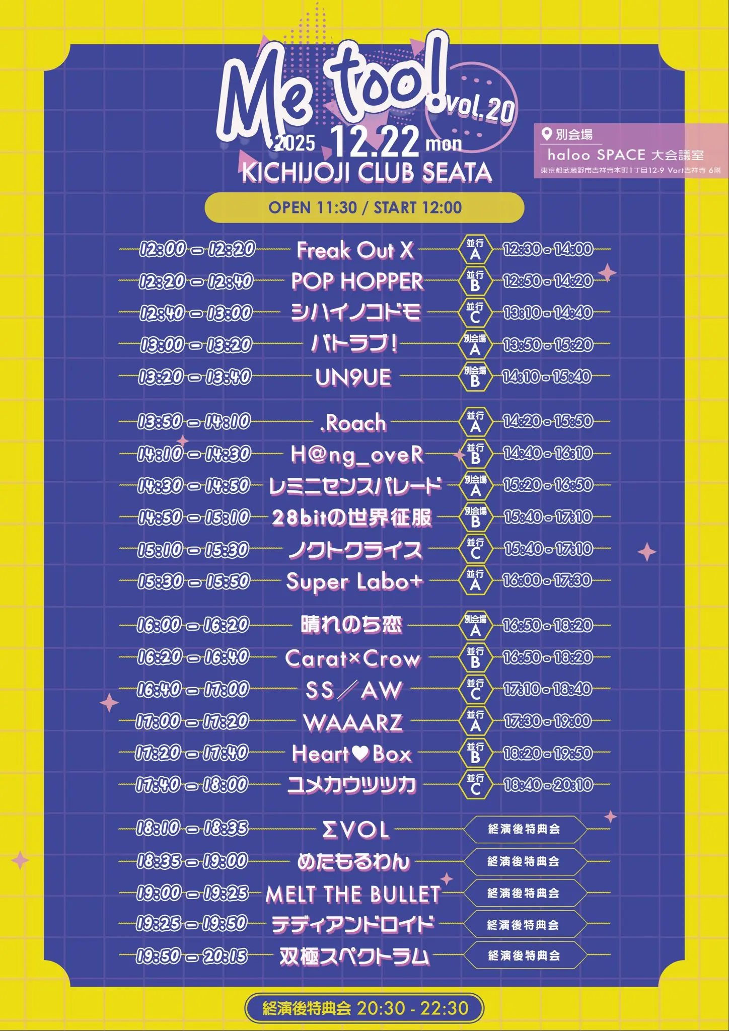- テディアンドロイド めたもるわん MELT THE BULLET 双極スペクトラム ΣVOL H@ng_oveR Carat×Crow SS/AW 晴れのち恋 ユメカウツツカ レミニセンスパレード Heart❤︎Box WAAARZ Super Labo+ ノクトクライス 28bitの世界征服 .Roach UN9UE バトラブ! シハイノコドモ POP HOPPER Freak Out X