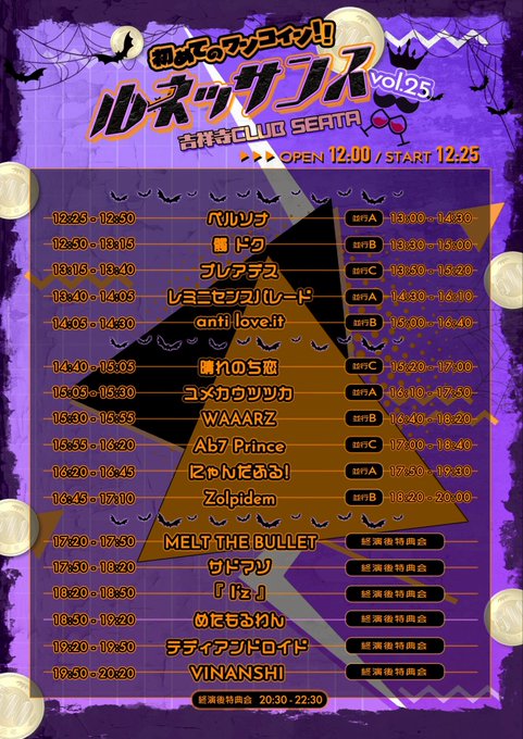 吉祥寺 CLUB SEATA スケジュール 2025.10.19(Sun) ルネッサンスvol.25 [OPEN/START] open 12:00 / start 12:25 [料金] ADV/DOOR ¥500/¥1,000 (1Drink代金¥700別途必要) チケ発】10/11(土)22:50~ ※チケットURLは1分前公開