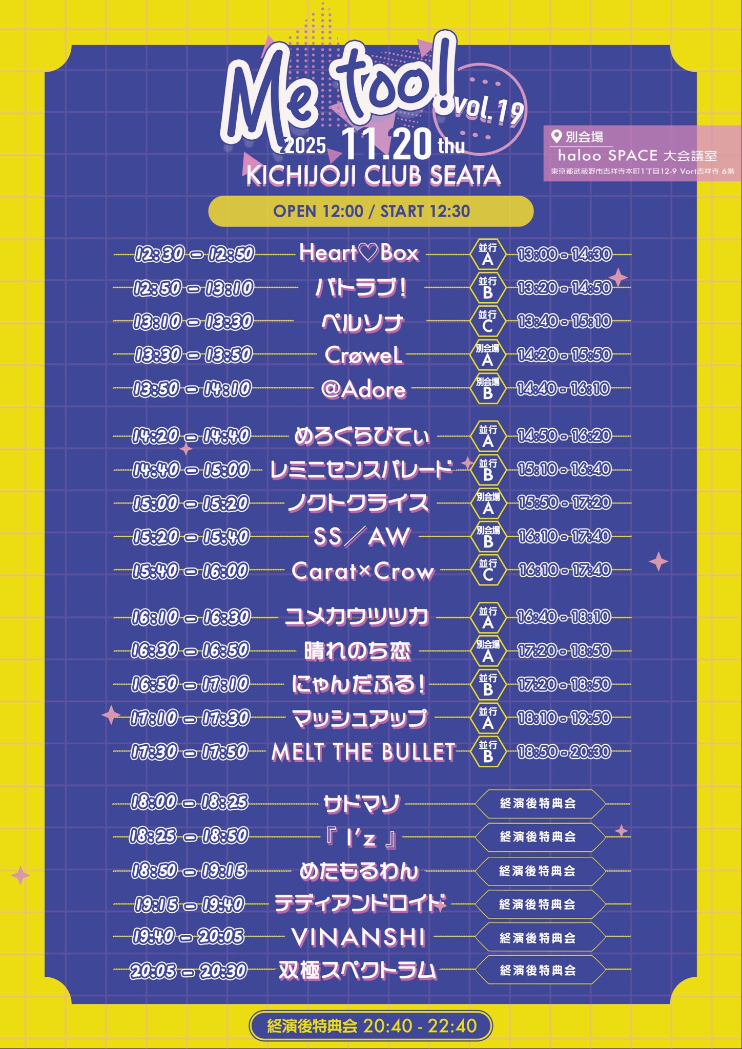 - 双極スペクトラム , VINANSHI , テディアンドロイド , めたもるわん , 『 I'z 』 , サドマゾ , MELT THE BULLET , マッシュアップ , にゃんだふる! , 晴れのち恋 , ユメカウツツカ , Carat×Crow , SS/AW , ノクトクライス , レミニセンスパレード , めろぐらびてぃ , @ Adore , CrøweL , バトラブ! , ペルソナ , Heart❤︎Box
