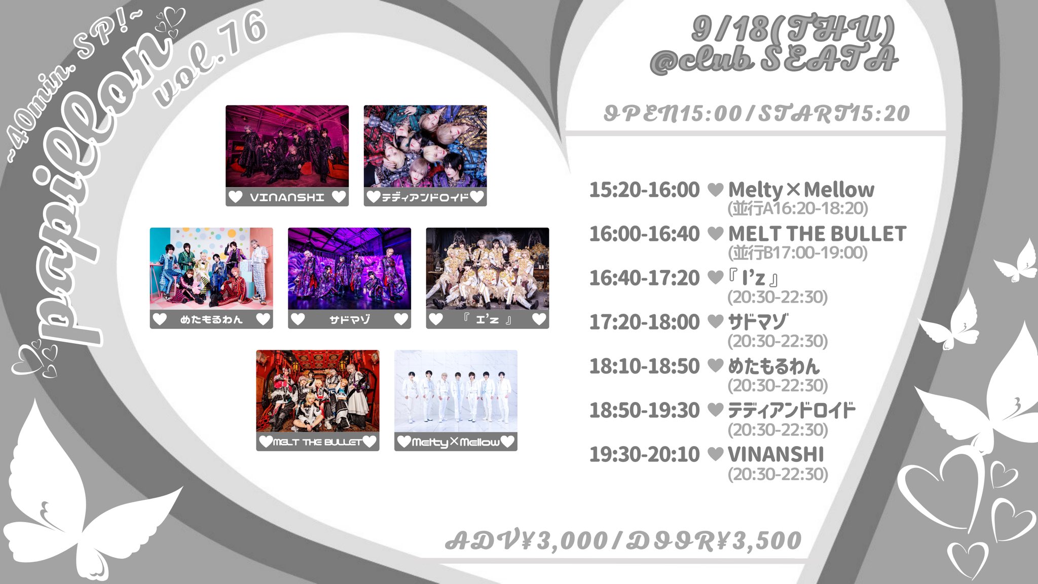 吉祥寺 CLUB SEATA スケジュール 2025.9.18(Thu) Papillon vol.76-40min. SP- [ACT] VINANSHI , テディアンドロイド , めたもるわん , サドマゾ , 『 I’z 』 , MELT THE BULLET , Melty×Mellow [OPEN/START] 15:00/15:20 [料金] ADV/DOOR ¥3,000/¥3,500 (1Drink代金¥700別途必要)