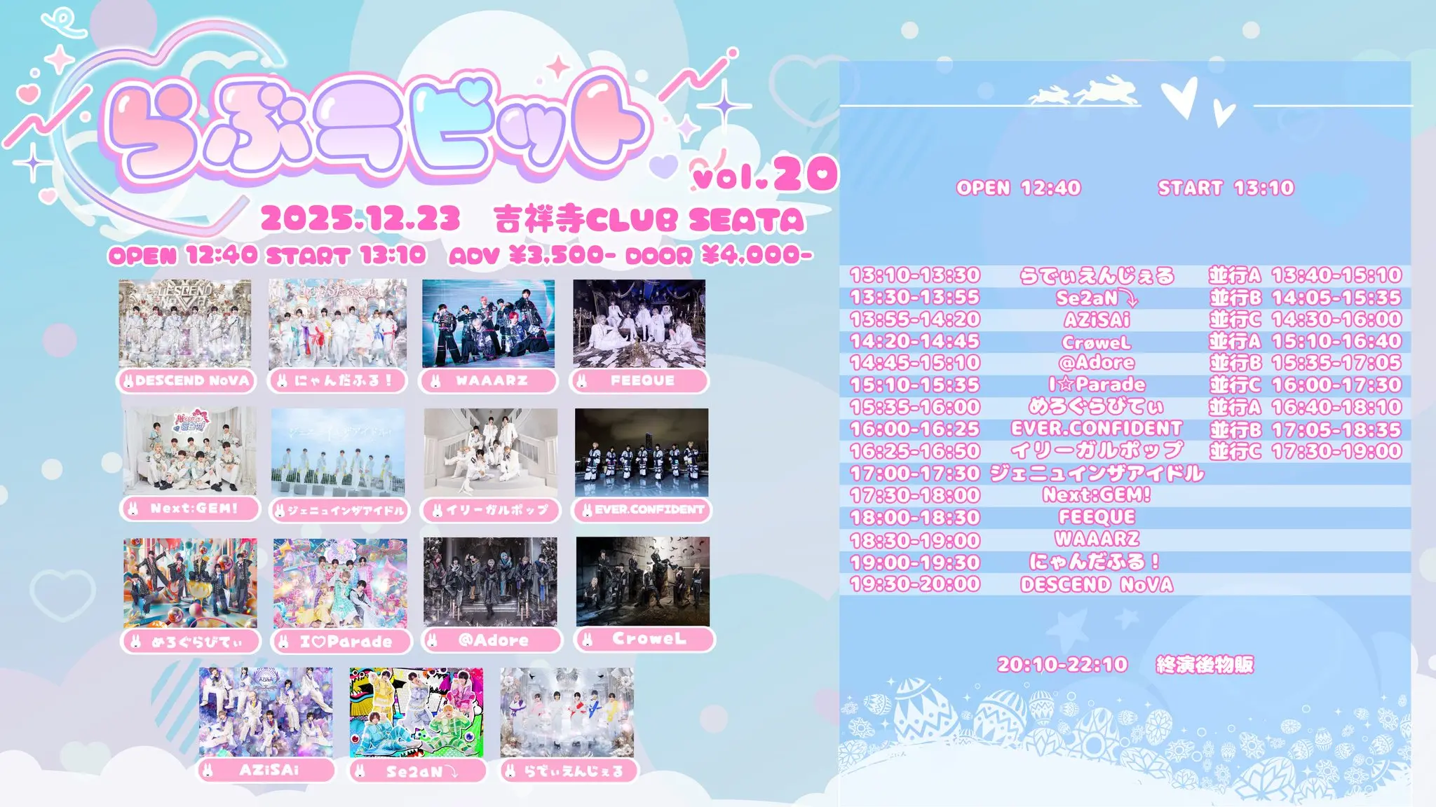 - DESCEND NoVA WAAARZ ジェニュインザアイドル Se2aN⤵︎ にゃんだふる! FEEQUE Next:GEM! イリーガルポップ EVER.CONFIDENT めろぐらびてぃ I☆Parade @Adore CroweL AZiSAi らでぃえんじぇる