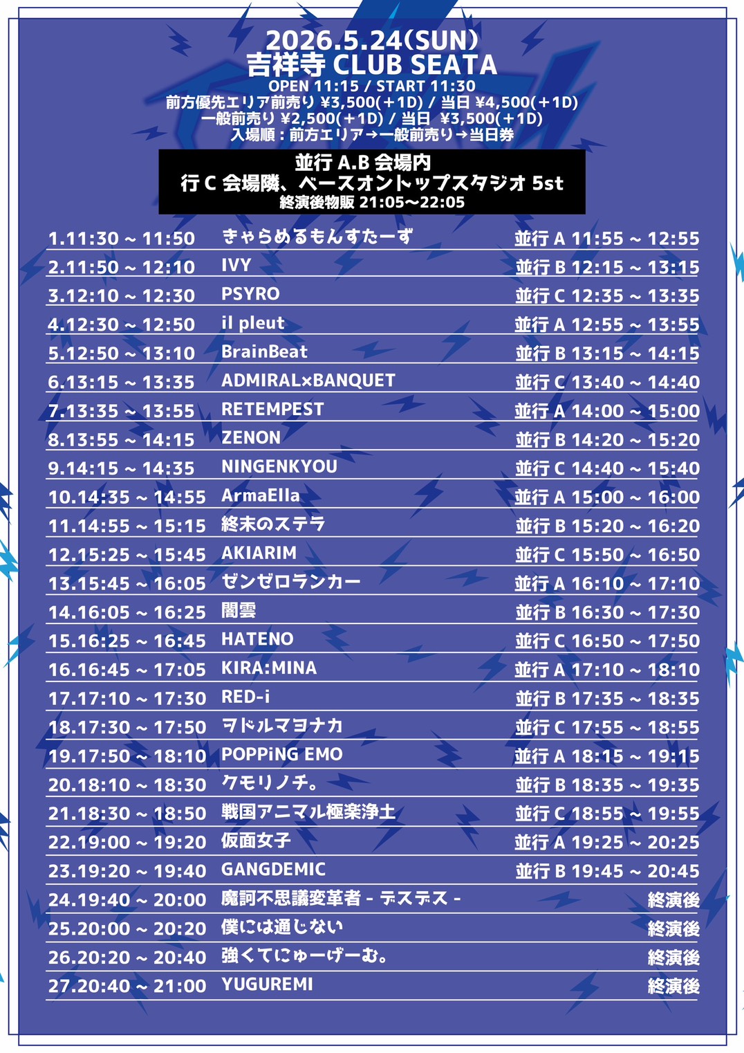 - ■前方優先エリア前売り3500円/当日4500円 , ■一般前売り2500円/当日3500円 (各1Drink代金¥700別途必要)