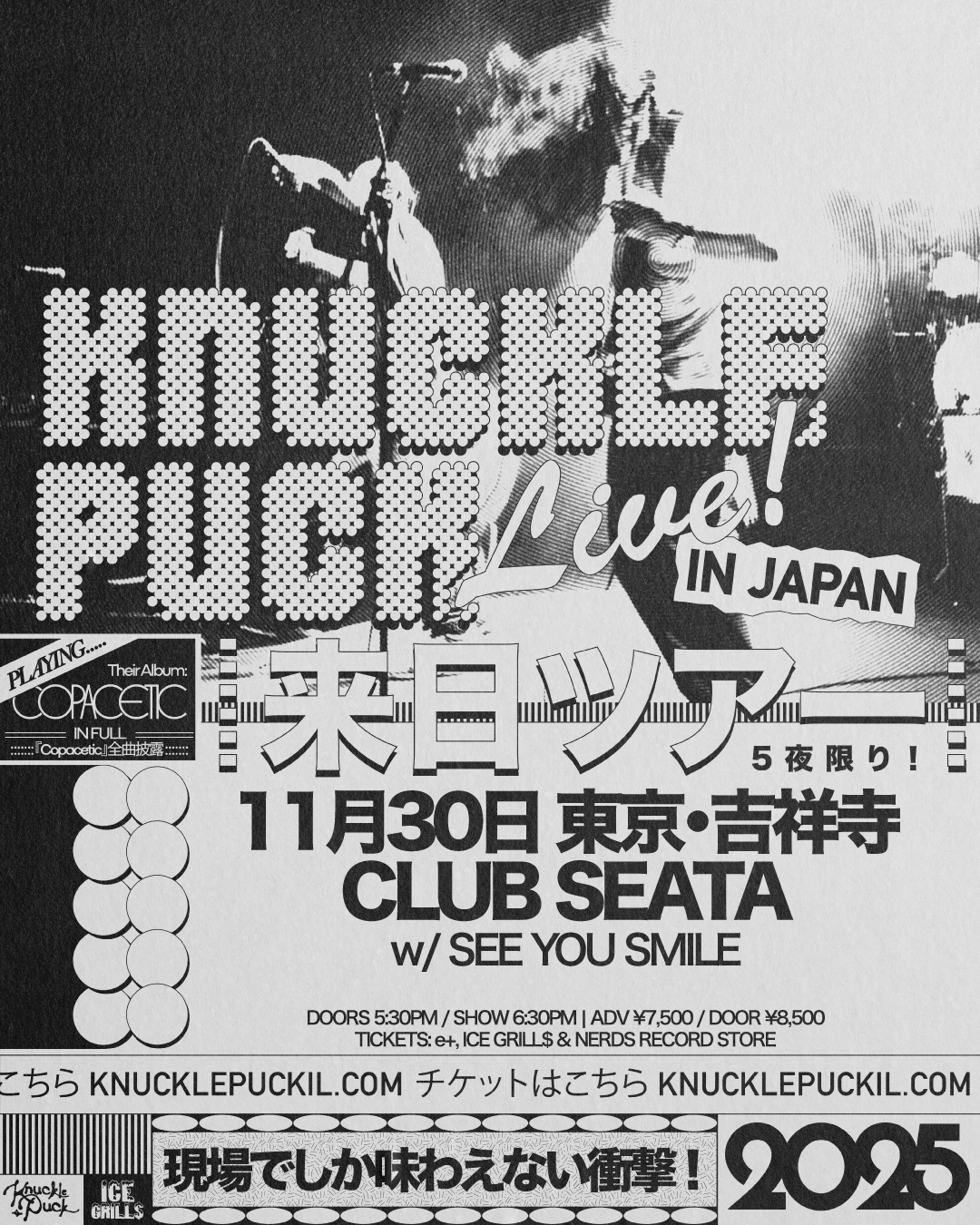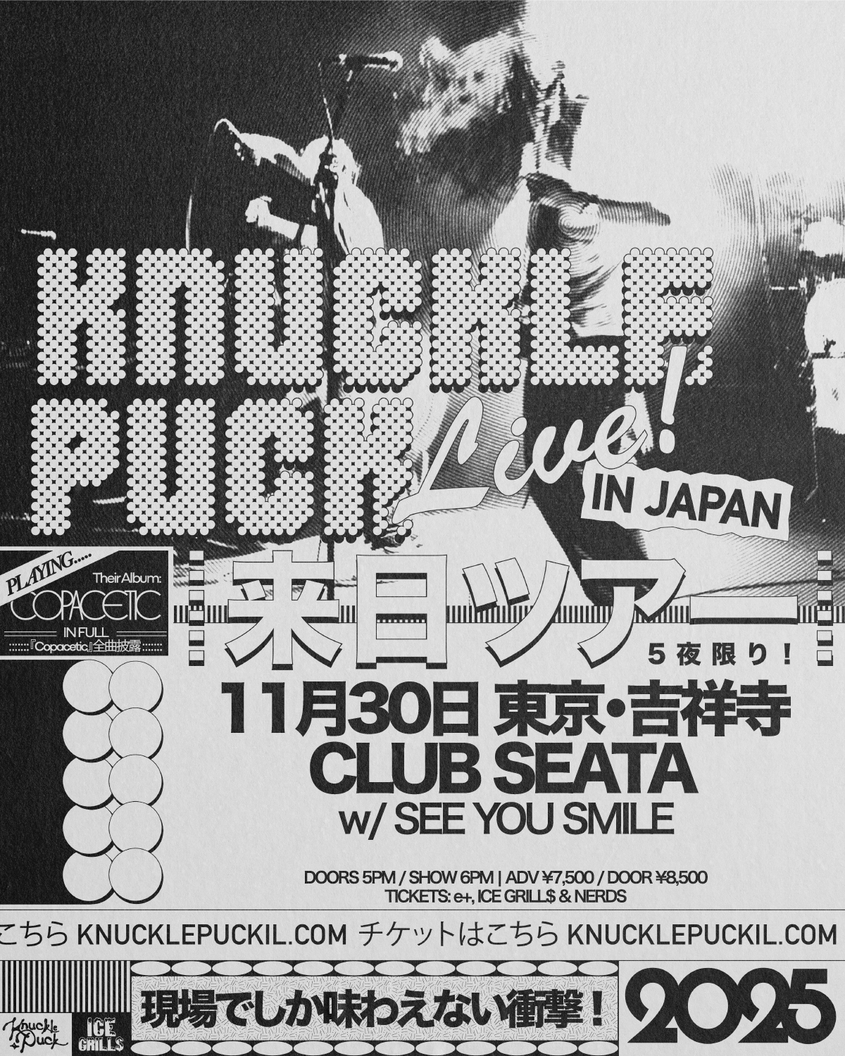 吉祥寺 CLUB SEATA スケジュール 2025.11.30(Sun) KNUCKLE PUCK "LIVE IN JAPAN 2025" [ACT] KNUCKLE PUCK / See You Smile [OPEN/START] 17:30/18:30 [料金] ADV/DOOR ¥7500/¥8500 (1Drink代金¥700別途必要) ■チケット e+ 6/28(土) 10:00発売