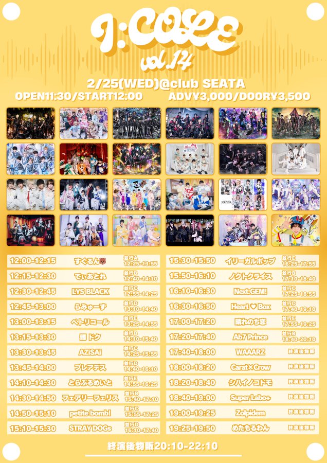 吉祥寺 CLUB SEATA スケジュール 2026.2.25(Wed) I:COLE vol.14 [OPEN/START] OPEN11:30/START12:00 [料金] ADV/DOOR ¥3,000/¥3,500 (1Drink代金¥700別途必要) 販売:2/16 22:30- ※22:40迄はクレジットカード決済のみ