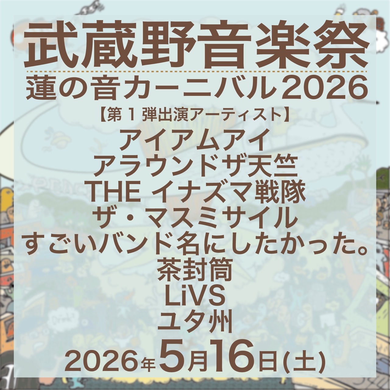 吉祥寺 CLUB SEATA スケジュール 2026.5.16(Sat) 武蔵野音楽祭蓮の音カーニバル2026 [OPEN/START] 11:30/12:00 [料金] TBA 会場:CLUBSEATA/Star Pine’s Café/ROCK JOINT GB/PLANETK/WARP/SHUFFLE/曼荼羅/BLACK&BLUE/PLANETC 総合受付:CLUBSEATA リストバンド交換開始:11:00~ OPEN:11:30~/START:12:00~ 【第1弾解禁アーティスト】 アイアムアイ、アラウンドザ天竺、THE イナズマ戦隊、ザ・マスミサイル、すごいバンド名にしたかった。、茶封筒、LiVS、ユタ州