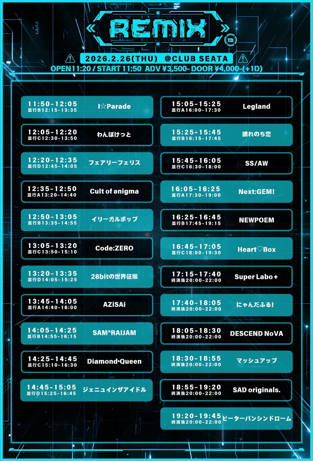 - Next:GEM! Super Labo + にゃんだふる! DESCEND NoVA マッシュアップ SAD originals. ピーターパンシンドローム Heart♡Box NEWPOEM Diamond・QueeN Cult of enigma SS/AW 晴れのち恋 Legland ジェニュインザアイドル SAM*RAIJAM AZiSAi 28bitの世界征服 Code:ZERO イリーガルポップ フェアリーフェリス わんぽけっと I☆Parade