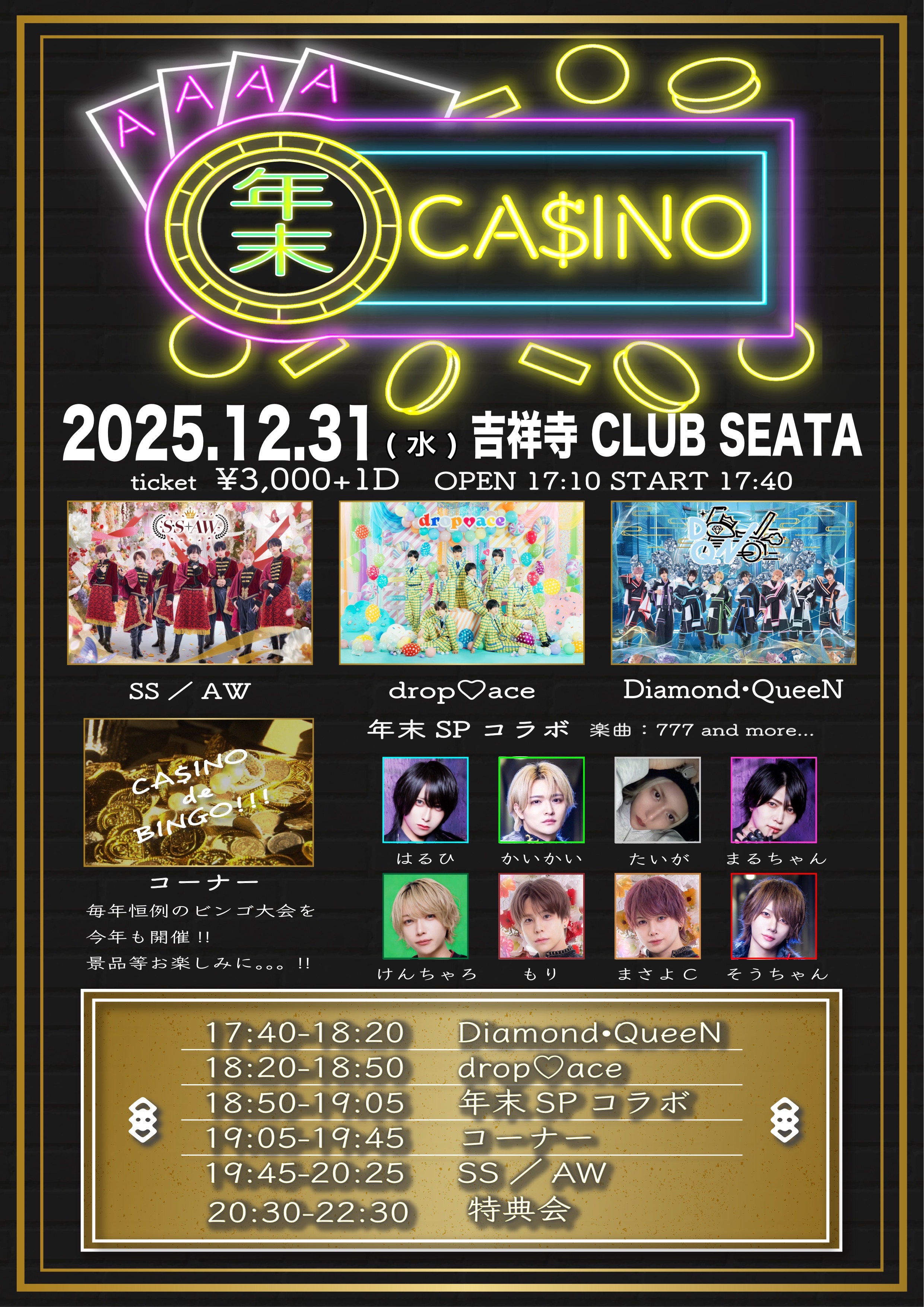 吉祥寺 CLUB SEATA スケジュール 2025.12.31(Wed) 年末裏CA$INO [ACT] SS/AW , Diamond Queen , drop♡ace [OPEN/START] 17:10/17:40 [料金] ADV/DOOR ¥3,000/¥3,000 (1Drink代金¥700別途必要) チケット販売 https://t.livepocket.jp/e/2_1g5