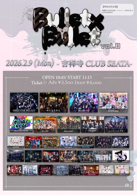 吉祥寺 CLUB SEATA スケジュール 2026.2.09(Mon) Bullet×Bullet vol.8 [OPEN/START] 10:45/11:15 [料金] ADV/DOOR ¥3,500/¥4,000 (1Drink代金¥700別途必要)