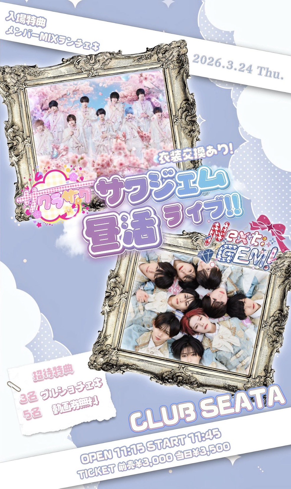 吉祥寺 CLUB SEATA スケジュール 2026.3.24(Tue) サクジェム昼活ライブ!! [ACT] Next:GEM! サクラサク [OPEN/START] 11:15/11:45 [料金] ADV/DOOR ¥3,000/¥3,500 (1Drink代金¥700別途必要) チケット販売 https://livepocket.jp/e/v0zlv
