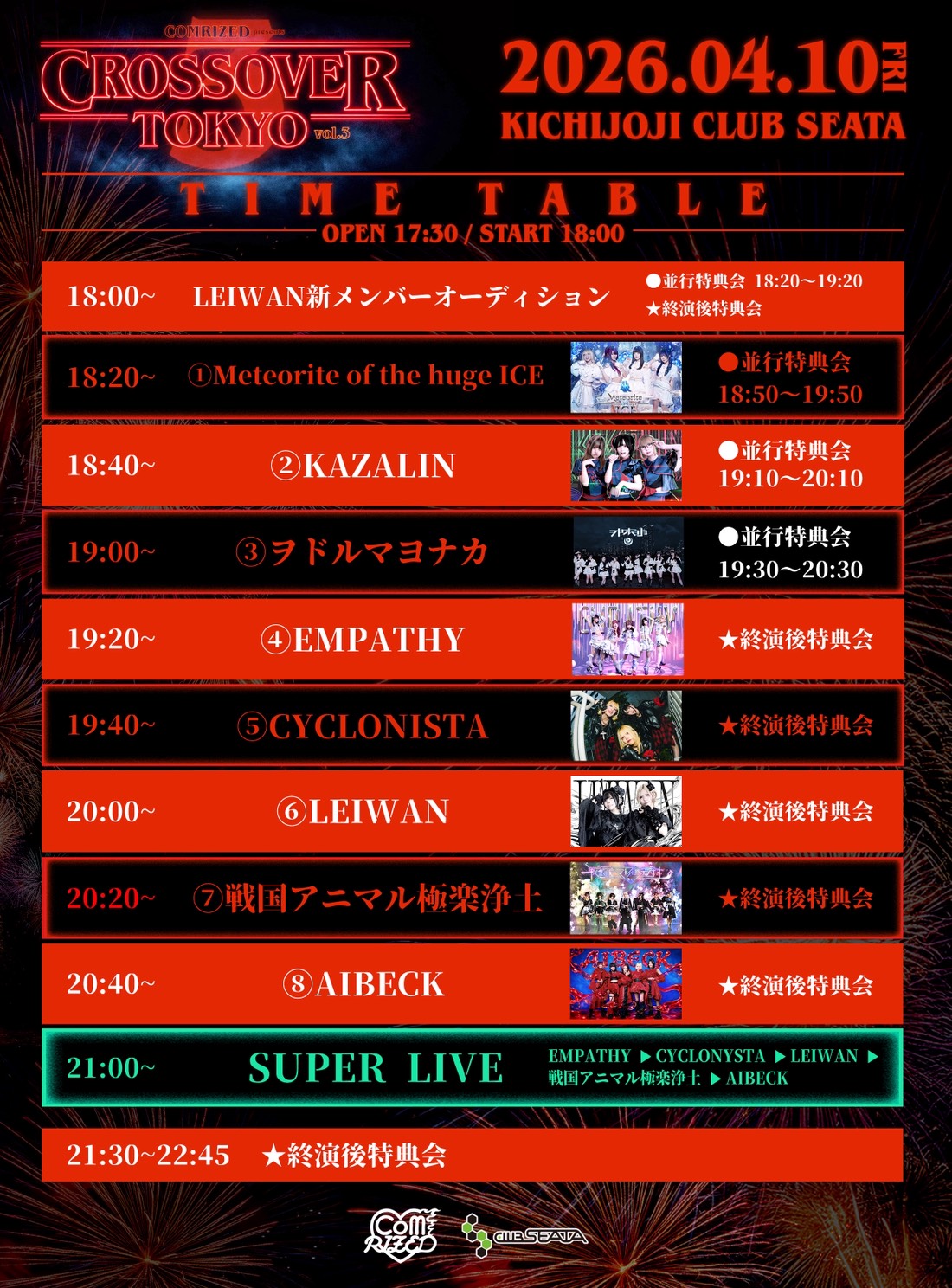 - 【LINE UP】 AIBECK LEIWAN EMPATHY KAZALIN LEIWAN新メンバーオーディション (Guest) CYCLONISTA 戦国アニマル極楽浄土 ヲドルマヨナカ Meteorite of the huge ICE