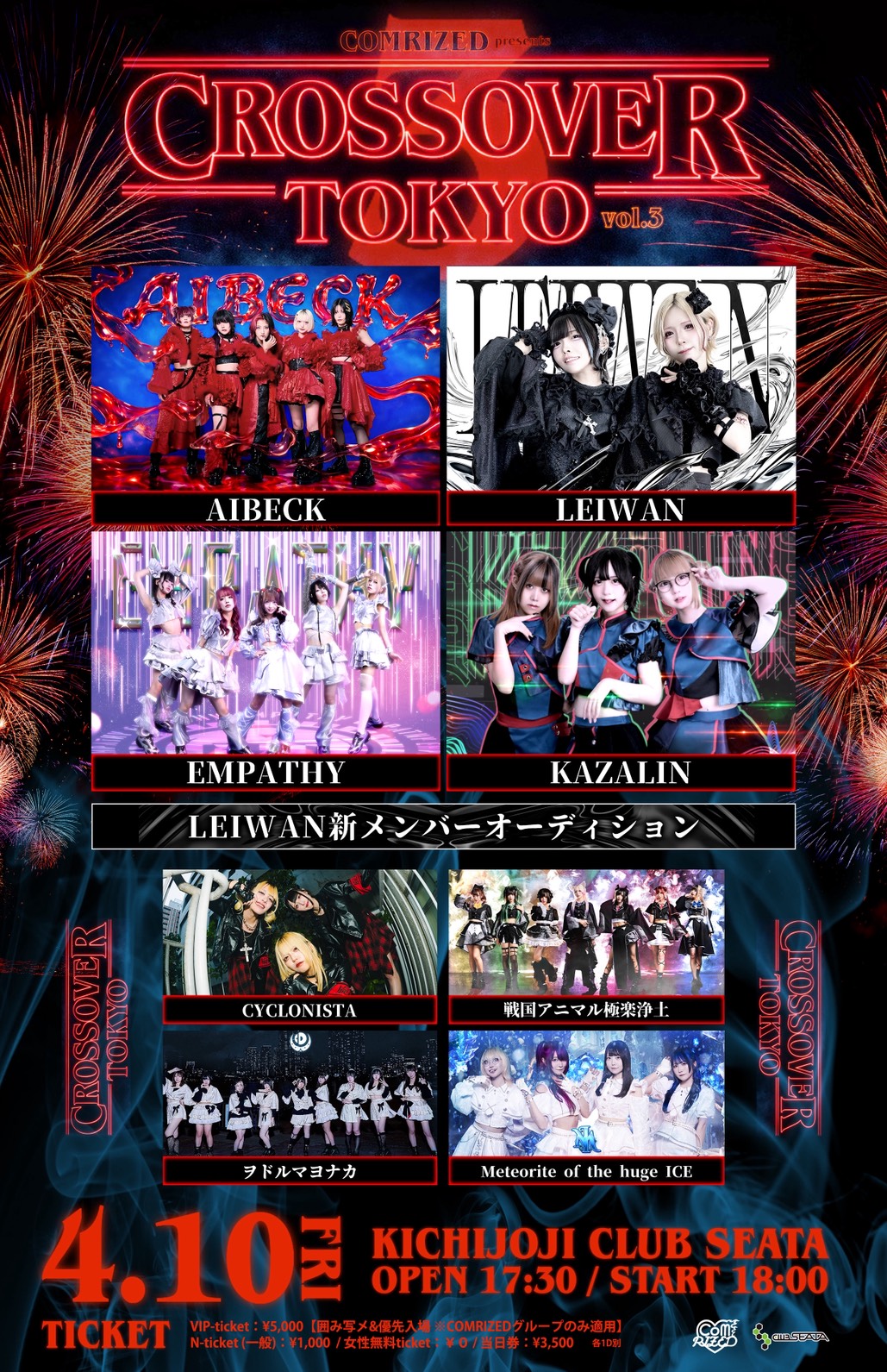 - VIP ticket:¥5,000(囲み写メ+優先入場)※COMRIZED限定 N ticket:¥1,000 女性無料ticket:¥0 当日券:¥3,500 (各1Drink代金¥700別途必要)