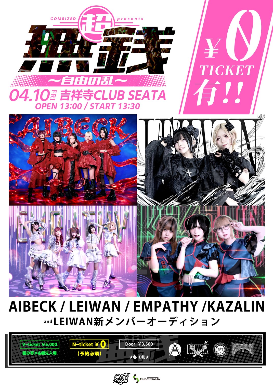 - 前売VIP:5,000円(30名限定/囲み写メ&優先入場) 前売N:0円 前売(当日支払い)1,500円 当日:2,900円 (1Drink代金¥700別途必要)