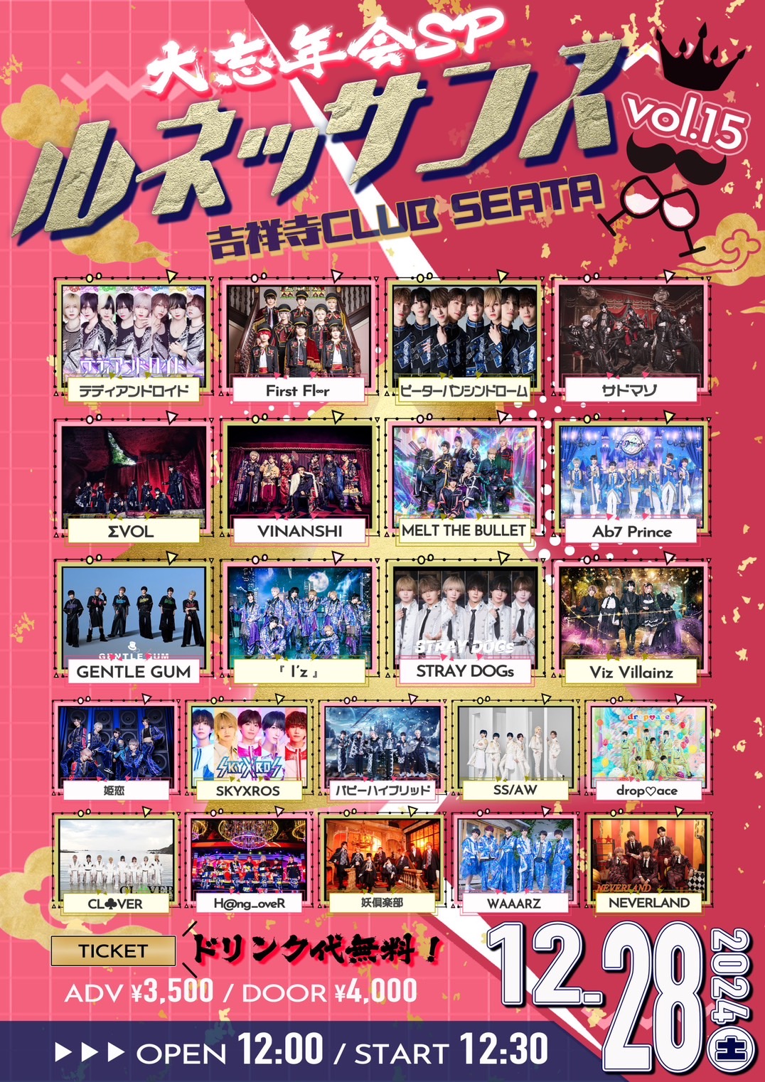 吉祥寺 CLUB SEATA スケジュール 2024.12.28(Sat) ルネッサンス vol.15 ?大忘年会SP? [OPEN/START] open 12:00 / start 12:30 [料金] ADV/DOOR ¥3,500/¥4,000 (1Drink代金無料) チケ発】12.14(土)22:50〜