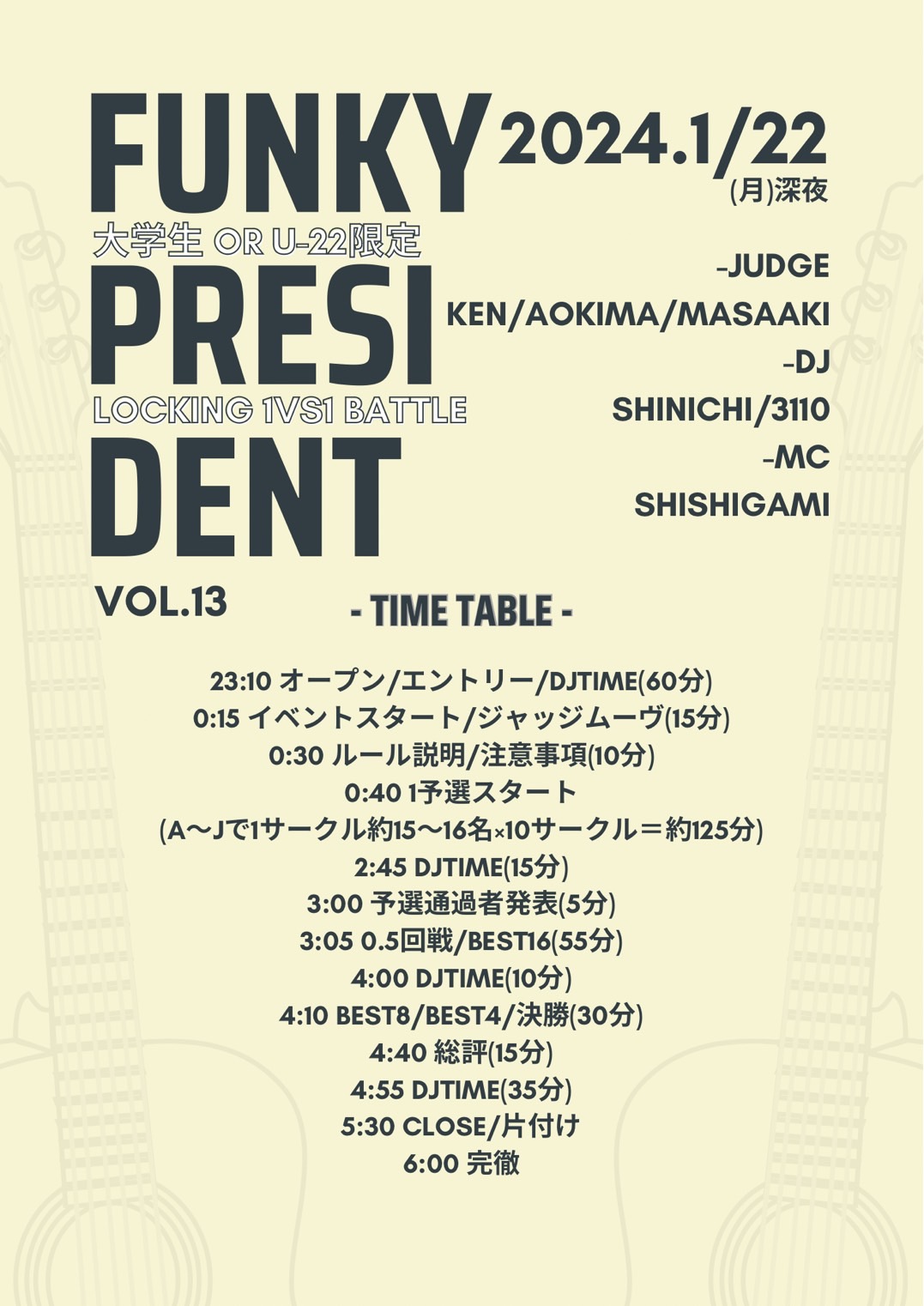 吉祥寺 CLUB SEATA スケジュール 2024.1.22(Mon) FUNKY PRESIDENT vol.13 [ACT] JUDGE:KEN / AOKIMA / MASAAKI DJ:SHINICHI / 3110 MC:SHISHIGAMI [OPEN/START] 23:10/23:10 [料金] ENTRY FEE:事前エントリー ¥3,500(+1D) / 当日エントリー ¥4,000(+1D) / 観戦のみ ¥2,000+1D ( 1DRINK ¥600 )