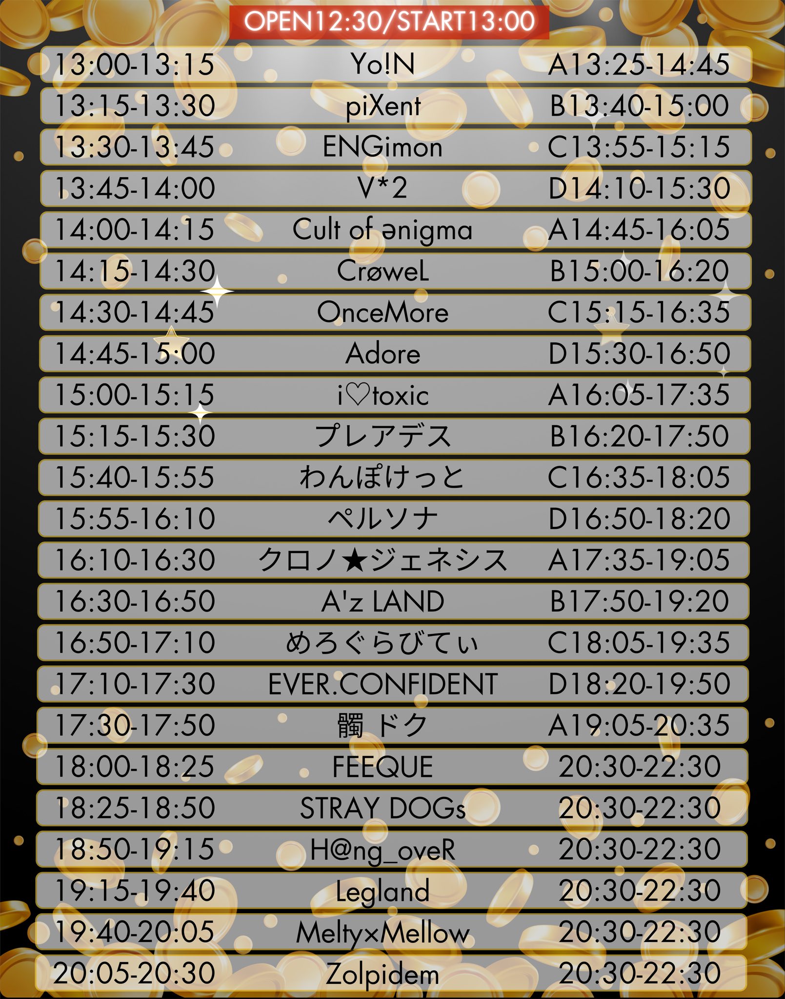 - Zolpidem , Melty×Mellow , Legland , H@ng_oveR , STRAY DOGs , FEEQUE , 髑 ドク , EVER.CONFIDENT , めろぐらびてぃ , A’z LAND , クロノ★ジェネシス , ペルソナ , わんぽけっと , プレアデス , i♡toxic , @Adore , OnceMore , CrøweL , Cult of ǝnigma , V*2 , ENGimon , piXent , YoiN