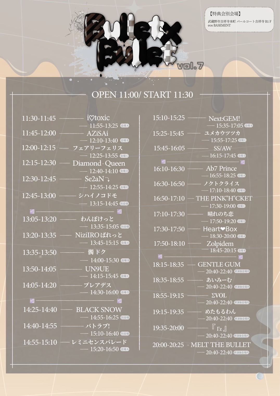 - MELT THE BULLET 『I'z』 Ab7Prince GENTLE GUM SS/AW レミニセンスパレード ユメカウツツカ BLACK SNOW Diamond Queen ΣVOL Zolpidem ノクトクライス 躅ドク バトラブ! UN9UE i♡toxic プレアデス フェアリーフェリス Se2aN⤵︎ シハイノコドモ わんぽけっと NiziIROぱれっと 晴れのち恋 Next:GEM! THE PINK "H"CKET めたもるわん あいみーむ AZiSAi Heart❤︎Box