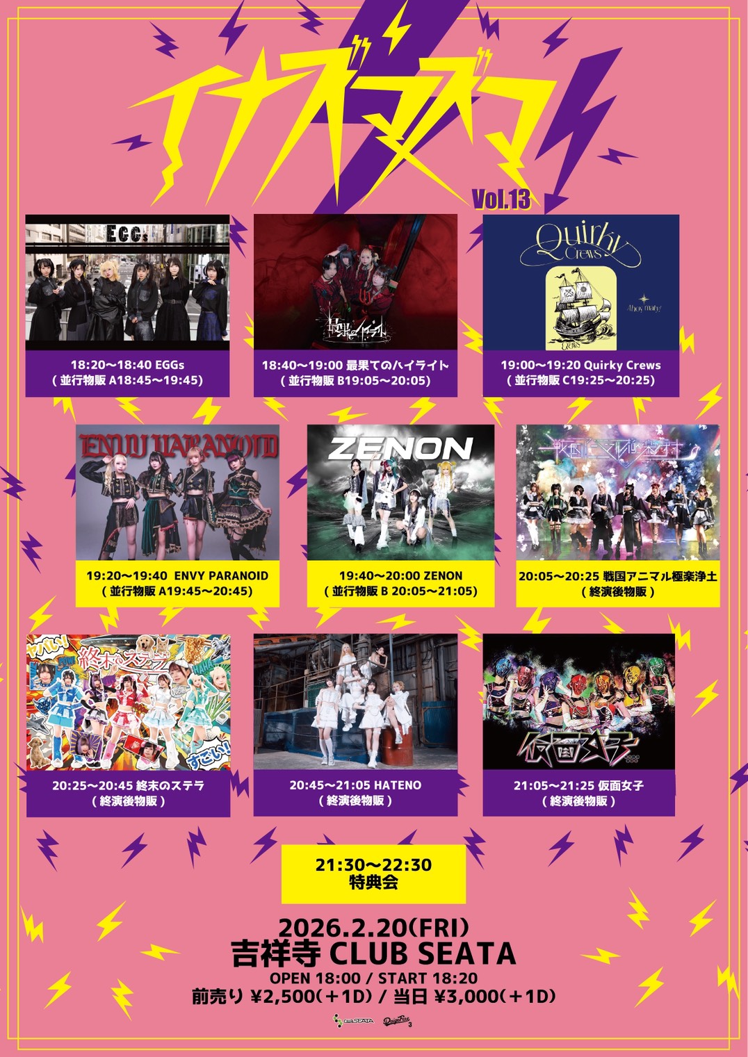 吉祥寺 CLUB SEATA スケジュール 2026.2.20(Fri) イナズマズマ vol.13 [ACT] 仮面女子 終末のステラ HATENO 戦国アニマル極楽浄土 最果てのハイライト ENVY PARANOID ZENON EGGs Quirky Crews [OPEN/START] 18:00/18:20 [料金] ADV/DOOR ¥2500/¥3000 (1Drink代金¥700別途必要) ◾️LivePocket https://livepocket.jp/e/q47zb