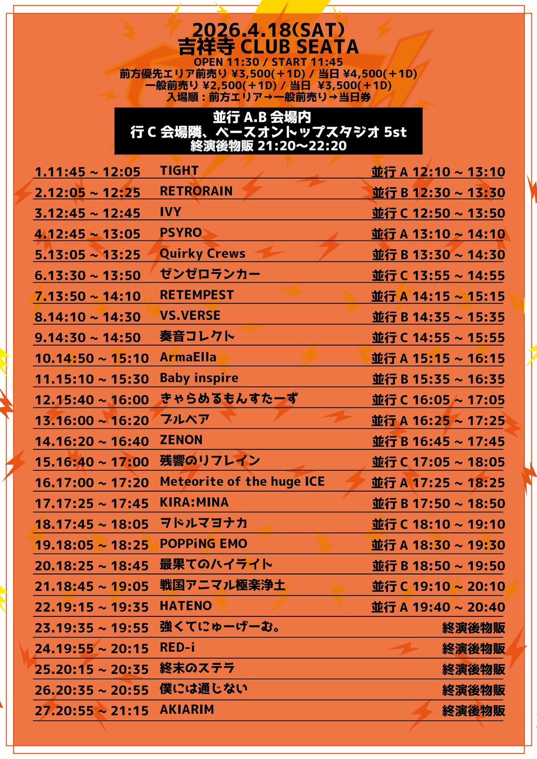 - 前方優先エリア前売り3500円/当日4500円(1Drink代金¥700別途必要) / 一般前売り2500円/当日3500円 (1Drink代金¥700別途必要)
