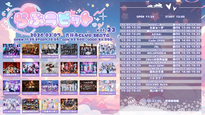 - DESCEND NoVA バトラブ! あいみーむ Magi♡9 Super Labo + Ab7 Prince 晴れのち恋 UNCOEUR Next:GEM! BLACK SNOW 28bitの世界征服 EVA.CoN MELOPHORiA Cult of enigma I9L RE:MODE Code:ZERO I☆Parade AZiSAi 幽幻MONSTRO らみゅーず Heart♡Box