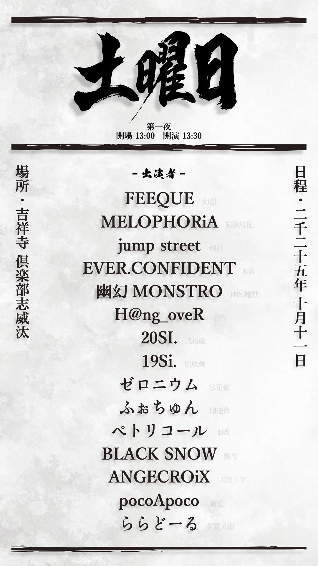 - FEEQUE , MELOPHORiA , jump street , EVER.CONFIDENT , 幽幻MONSTRO , H@ng_oveR , 20SI. , 19Si. , ゼロニウム , ふぉちゅん , ペトリコール , BLACK SNOW , ANGECROiX , pocoApoco , ららどーる