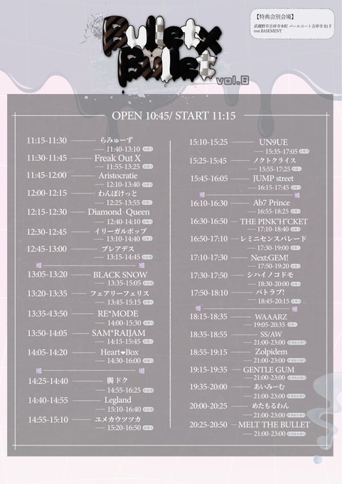 吉祥寺 CLUB SEATA スケジュール 2026.2.09(Mon) Bullet×Bullet vol.8 [OPEN/START] 10:45/11:15 [料金] ADV/DOOR ¥3,500/¥4,000 (1Drink代金¥700別途必要)