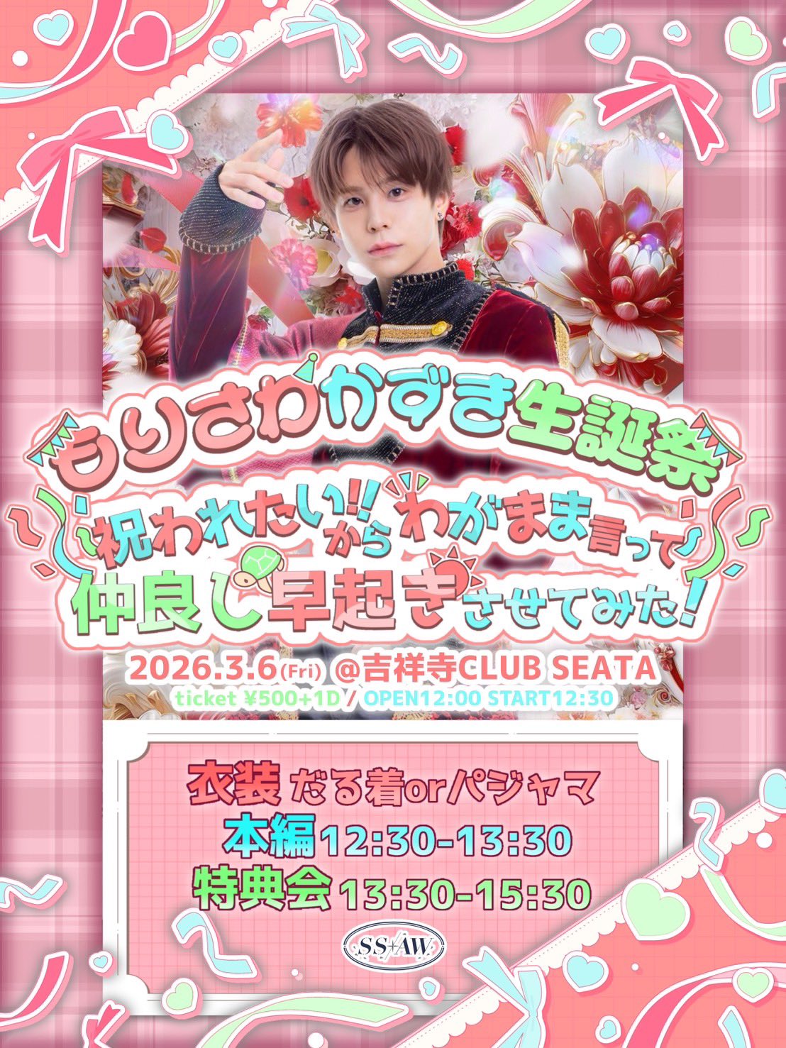 吉祥寺 CLUB SEATA スケジュール 2026.3.06(Fri) もりさわかずき生誕祭(1部) ~祝われたいからわがまま言って仲良し早起きさせてみた~ [OPEN/START] OPEN/12:00 START/12:30 [料金] ADV/DOOR ¥500/¥-- (1Drink代金¥700別途必要)
