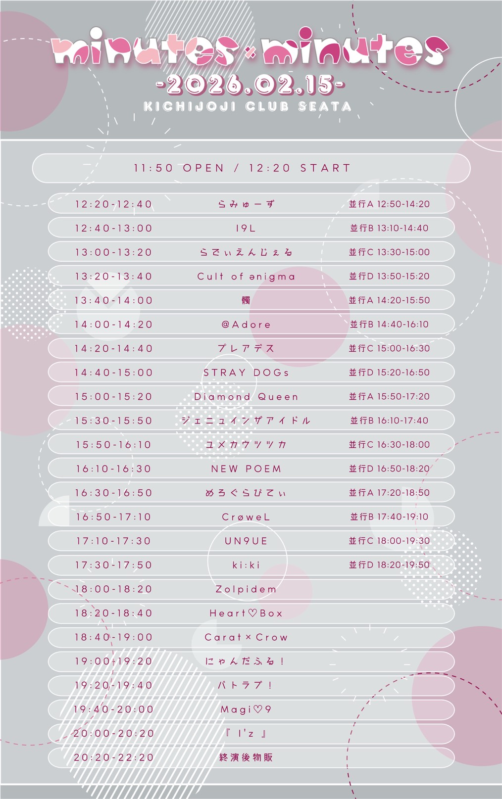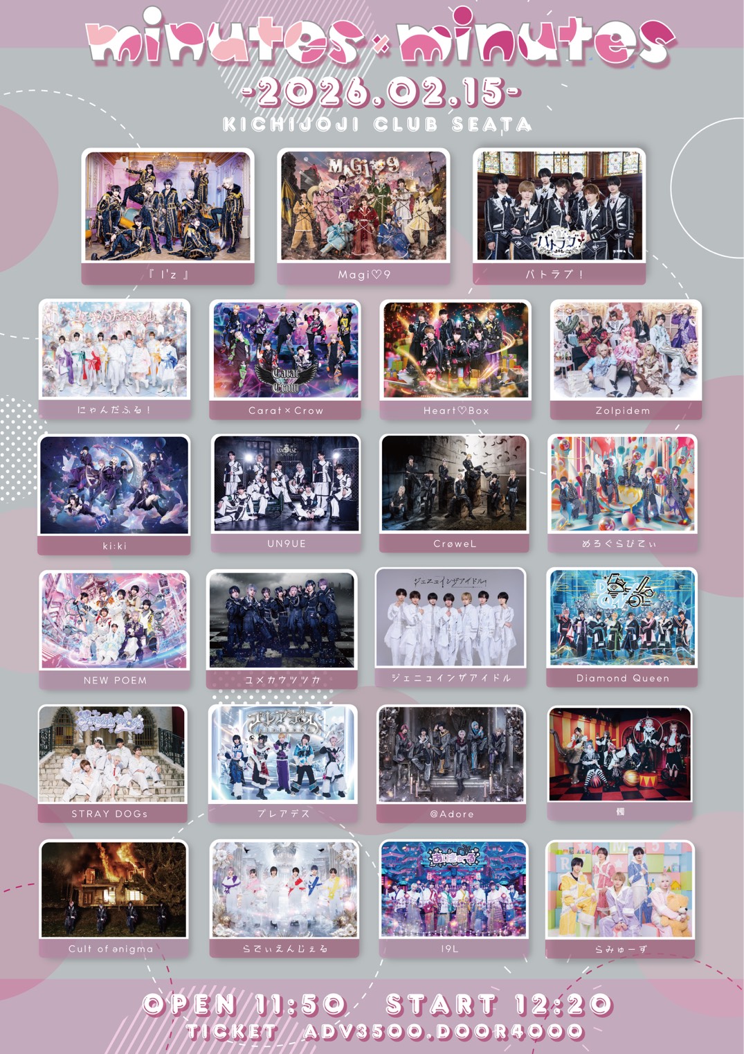吉祥寺 CLUB SEATA スケジュール 2026.2.15(Sun) minutes×minutes vol.58 [OPEN/START] 11:50/12:20 [料金] ADV/DOOR ¥3,500/¥4,000 (1Drink代金¥700別途必要) チケ発 : 2026.02.11(水)23:10〜 https://livepocket.jp/e/minutes58