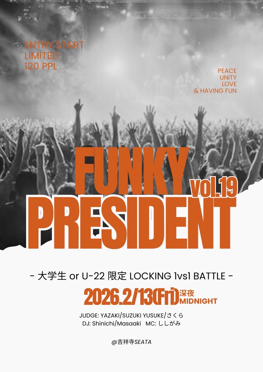 吉祥寺 CLUB SEATA スケジュール 2026.2.13(Fri) Funky President vol.19 [OPEN/START] 23:10 OPEN / 24:10 START 5:30 CLOSE [料金] 事前エントリー ¥3,500+1D (¥700) 当日エントリー ¥4,000+1D (¥700) 観覧 ¥2,000+1D (¥700) ?JUDGE ・YAZAKI (ゲロッパ/fumihiroko) ・SUZUKI YUSUKE (DOWNTOWNBOUNCE/BRO of MADE IN FUNK) ・さくら(SAKURARCH/海咲子&さくら) ?MC ししがみ (巣鴨UG/Theムササビ) ?DJ BATTLE DJ ・Shinichi (TACOBELL CREW?) FLOOR DJ ・Masaaki (No spectator/CNS) ※深夜イベントのため20歳未満はご入場いただけません。 ※ご入場の際身分証確認を致しますので身分証をお持ちください。