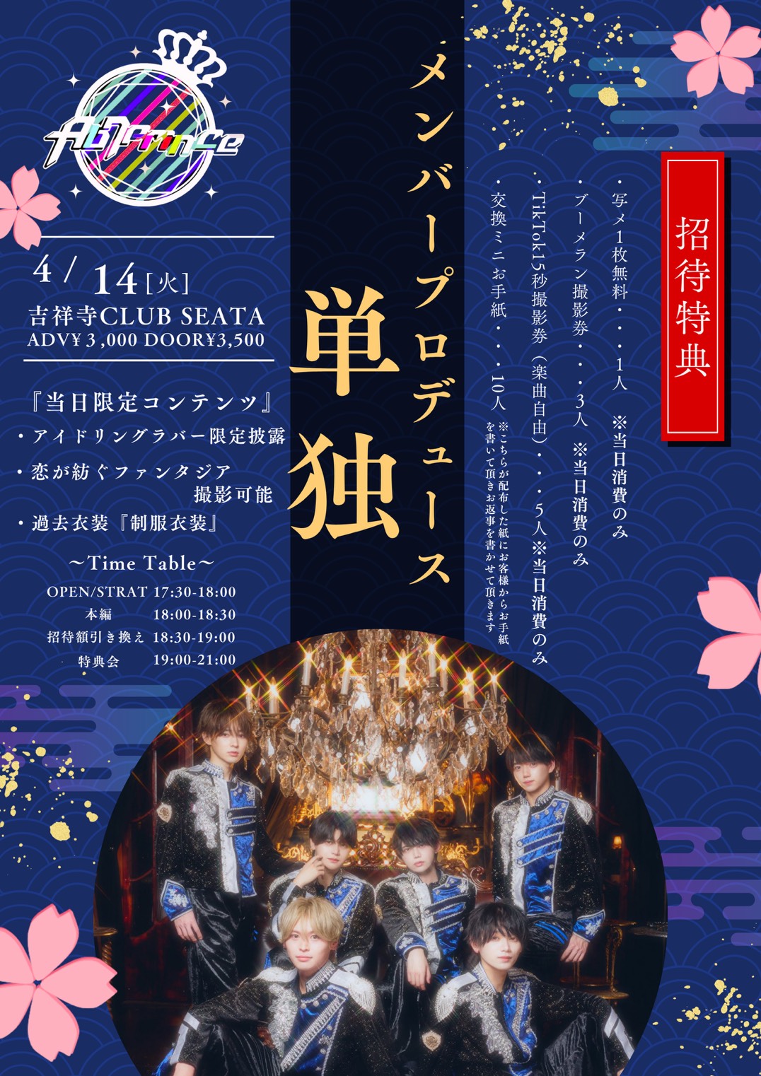 吉祥寺 CLUB SEATA スケジュール 2026.4.14(Tue) A.P.7 -初メンバープロデュース- [ACT] Ab7Prince [OPEN/START] 17:30/18:00 [料金] ADV/DOOR ¥3,000/¥3,500 (1Drink代金¥600別途必要) チケット販売 https://livepocket.jp/e/awi7v