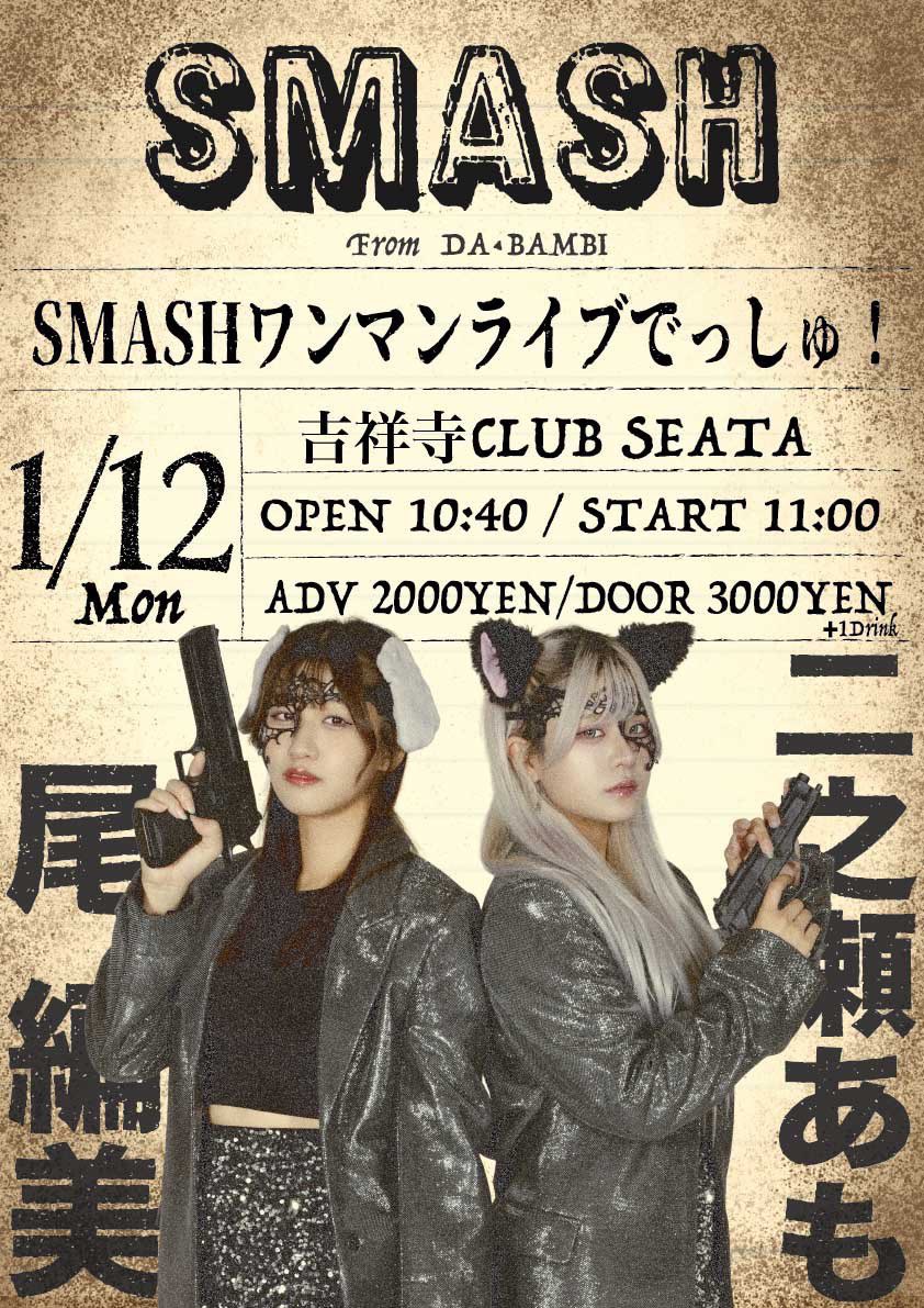 吉祥寺 CLUB SEATA スケジュール 2026.1.12(Mon) SMASH1st ONE MAN 『SMASHワンマンライブでっしゅ!』 [ACT] SMASH (尾 編美、二之瀬あも) [OPEN/START] 10:40/11:00 [料金] ●一般エリアチケット・・・¥2,000 ●当日チケット¥3000 ※各+1ドリンク代 ※再入場可(+1ドリンク代) ※入場制限あり チケット販売 https://t.livepocket.jp/e/xth7c