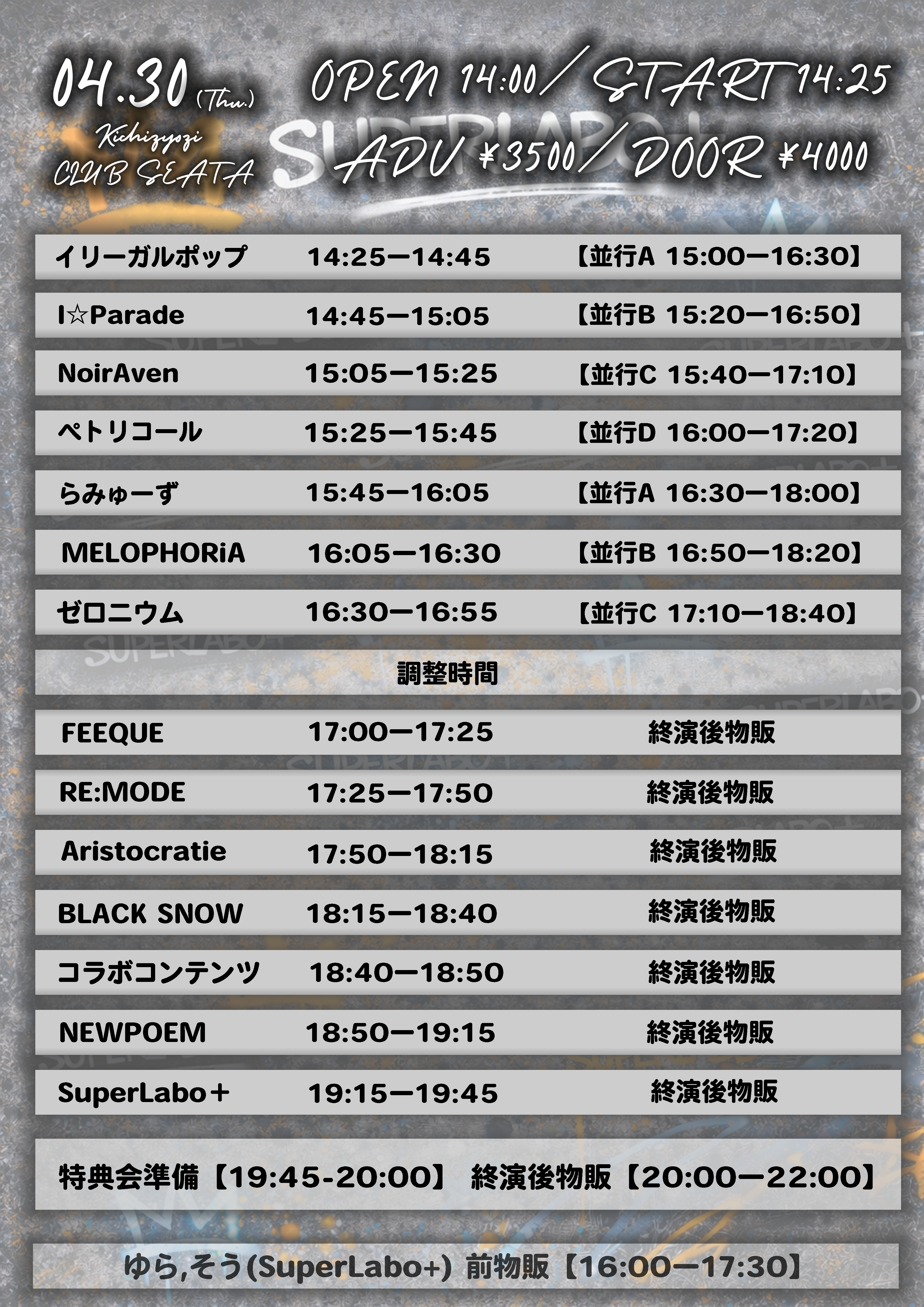 - イリーガルポップ I☆Parade ペトリコール らみゅーず MELOPHORiA ゼロニウム FEEQUE RE:MODE Aristocratie BLACK SNOW NEWPOEM SuperLabo+